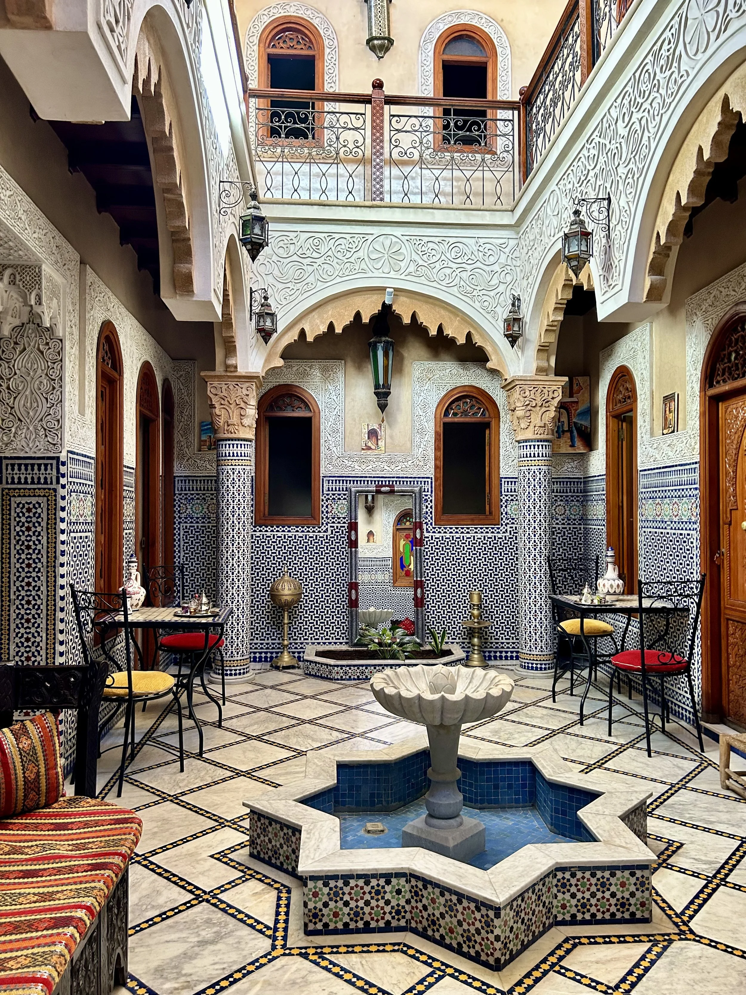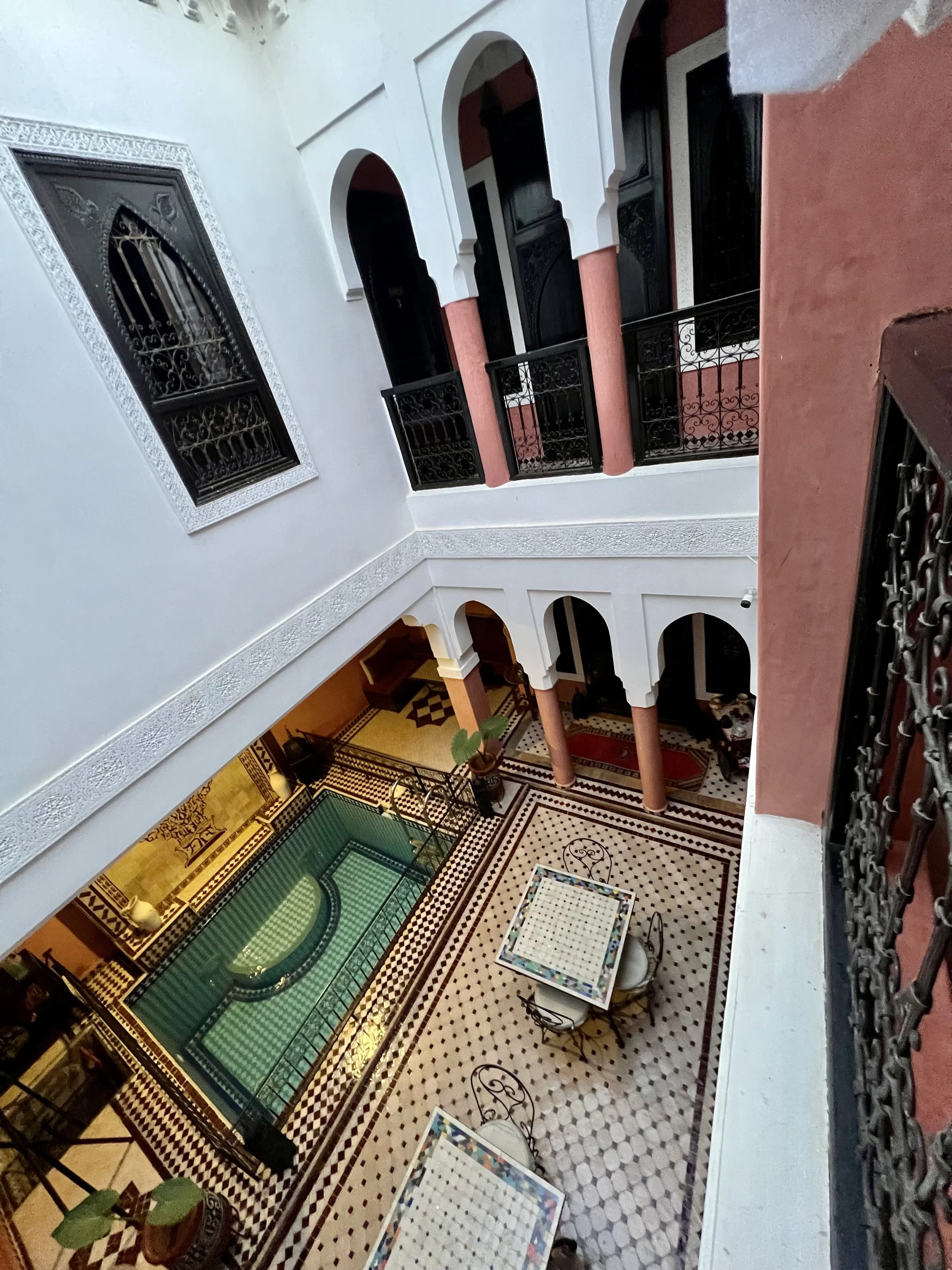 Verificați ce ați vrea să vizitați în Marrakech și luați aceasta în considerare acest aspect atunci când verificați cazările disponibile. Pentru că majoritatea obiectivelor sunt în Medina sau pe lângă, veți găsi multe cazări în Medina dar și pe lângă. Noi am recomanda o cazare în apropierea unei porți care să vă asigure accesul în Medina, dar nu neapărat în interiorul orașului vechi, pentru că ziua este plin de turiști, motociclete și devine aglomerat. Iar seara poate să fie ușor ciudățel, deoarece apar mulți localnici care vă pot aborda oferindu-vă direcții și indicații spre diverse locații. V-am recomanda să stați în riaduri, care sunt niște case tradiționale pătrate cu ziduri înalte, cu o curte interioară unde este o piscină sau o fântână. Apa din interior are rol de a răcori încăperea, iar curtea era locul unde se vedeau și puteau să stea femeile la povești, departe de ochii lumii. În pozele de mai jos sunt riadurile în care am stat, nu sunt muzee sau cafenele.