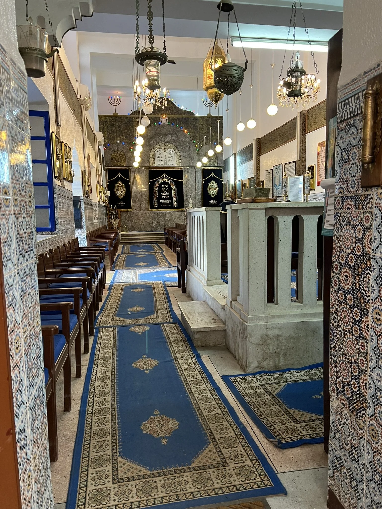 Sinagoga este un obiectiv mai puțin obișnuit, având în vedere că vizităm o țară arabă. Nu l-am pus pe listă înainte să ajungem aici, dar din întâmplare am aflat despre evreii berberi și că în trecut era un întreg cartier al evreilor - Mellah, așa am hotărât să o vizităm. Biletul este doar 10 MAD, și de aceea l-am încadrat la categoria obiectivelor gratis. A fost foarte neobișnuit și un paradox să văd Tora în arabă. În camerele de la parter sunt informații despre istoria evreilor din Maroc, poze cu foștii elevi și câteva detalii despre evreii berberi. De asemenea, se organizează diverse expoziții - noi am prins una de fotografie.